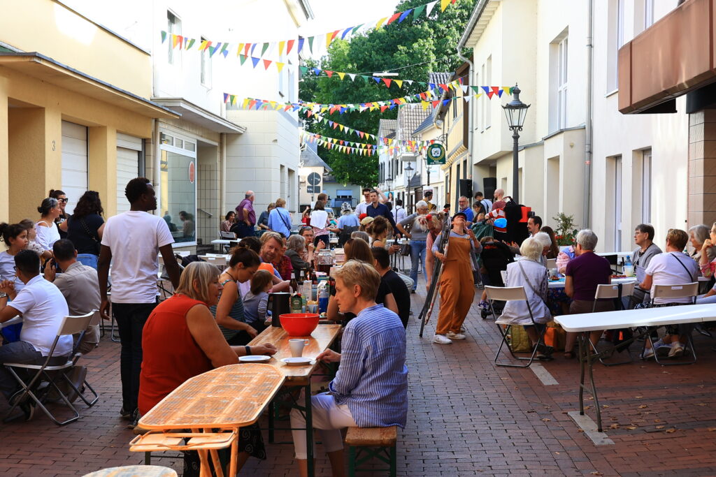 Viele nette Menschen, tolle Stimmung, interessante Gespräche, fantastisches Wetter, gutes Essen, wunderbare Live-Musik – das sind gemeinhin die „Zutaten“ für ein gelungenes Straßenfest. Und genau die gab es vergangenen Samstag beim ersten „Bunten Dinner“ in der Lannesdorfer Straße. Die Lannesdorferinnen und Lannesdorfer sowie alle anderen, die mitfeierten, erlebten in der Zeit von 16 bis 22 Uhr ein tolles Fest, bei dem für jede und jeden etwas dabei gewesen ist. Den Auftakt machte die Compagnia Nasenspiel, eine Truppe von Clowninnen und Clowns, die plötzlich mit viel Getöse in die Straße einbog und nicht nur die Kleinen zum Lachen brachte. Danach ging es, was die musikalische Darbietung angeht, Schlag auf Schlag. Die verschiedenen Musikerinnen und Musiker sorgten nicht nur für gute Laune, sondern motivierten die zahlreichen Straßenfest-Besucherinnen und Besucher zum Mitsingen, Schunkeln und Tanzen. Ganz zum Schluss sogar bei Vollmond, denn der schien irgendwann genau in den Straßenabschnitt und sorgte für eine ganz besondere Atmosphäre.